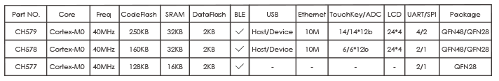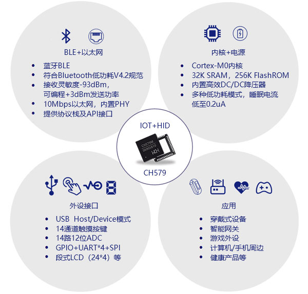 概述 CH579是集成BLE无线通讯的ARM内核32位微控制器。片上集成低功耗蓝牙BLE通讯模块、以太网控制器及收发器、全速USB主机和设备控制器及收发器、段式LCD驱动模块、ADC、触摸按键检测模块、RTC等丰富的外设资源。