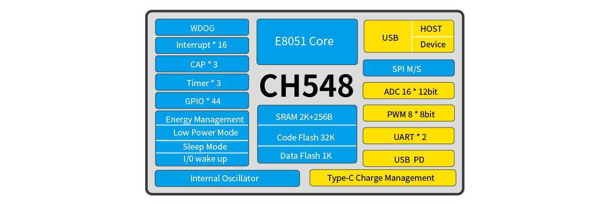 CH548 内嵌USB控制器和USB收发器支持 USB-Host 主机模式和 USB-Device 设备模式,支持 USB 2.0 全速 12Mbps 或者低速 1.5Mbps,支持USB PD和Type-C。支持最大 64 字节数据包,内置 FIFO,支持 DMA。