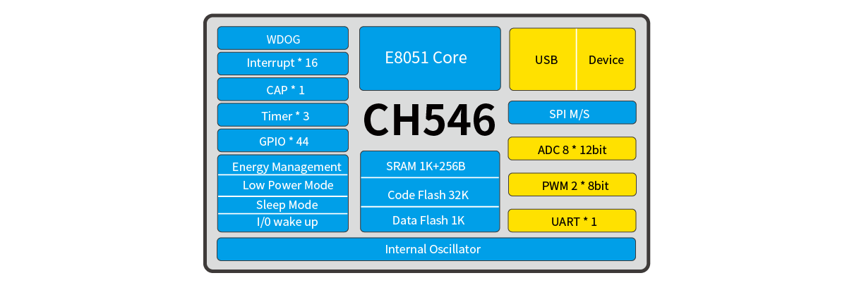 CH554内嵌全速USB控制器,支持USB HOST主机模式和USB DEVICE设备模式。