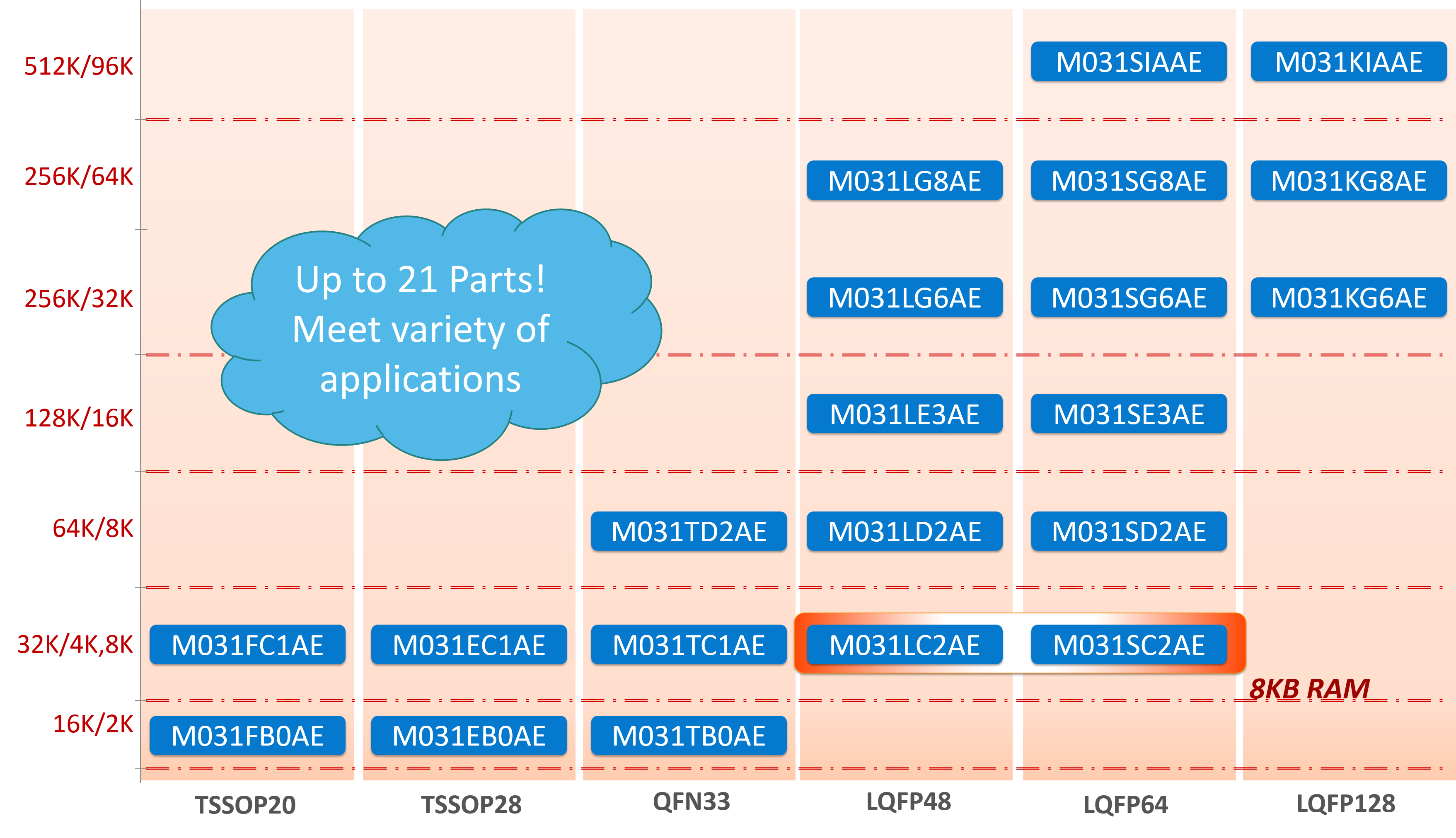 M031 系列提供 16 KB 至 512 KB 的 Flash,从 2 KB 到 96 KB 的 SRAM 。支持封装尺寸从小尺寸 TSSOP20、TSSOP28、QFN33、LQFP48 到 LQFP64 和 LQFP128 引脚,不同型号相同封装引脚兼容,使系统易于设计和更换器件。