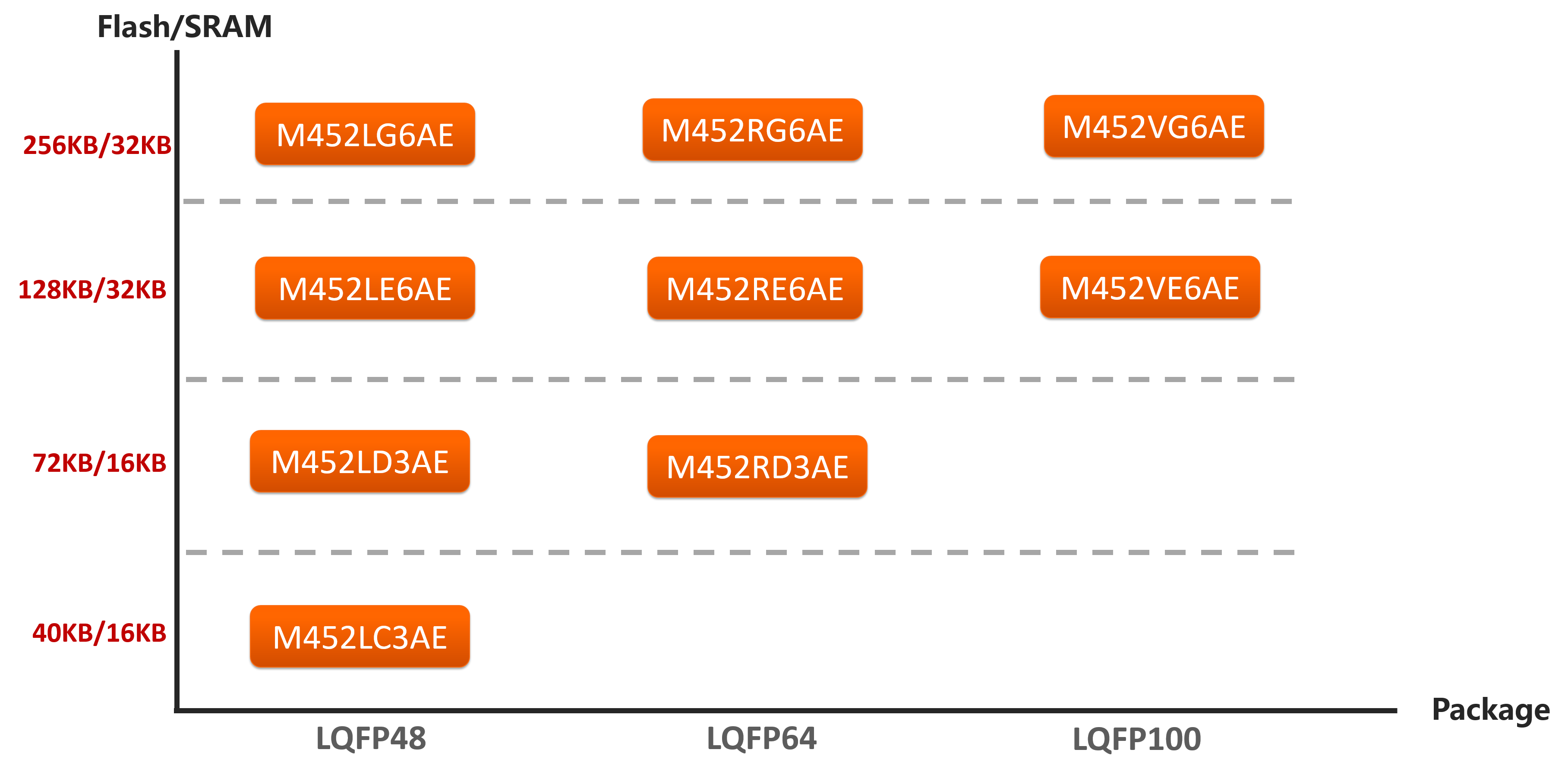 新唐NuMicro® M452 USB系列是基于ARM® Cortex®-M4内核的新一代 32 位 的微控制器,宽工作电压 ( 2.5V ~ 5.5V ) ,工业级温度 ( - 40 ℃ ~ 105 ℃ ) ,内置 22.1184 MHz 晶振 ( 在25 ℃ ,5V时精度1 % ) ,可配置Data Flash,强抗干扰性 ( ESD 8 kV 、EFT 4 kV ) ,封装类型有LQFP48、LQFP64和LQFP100。