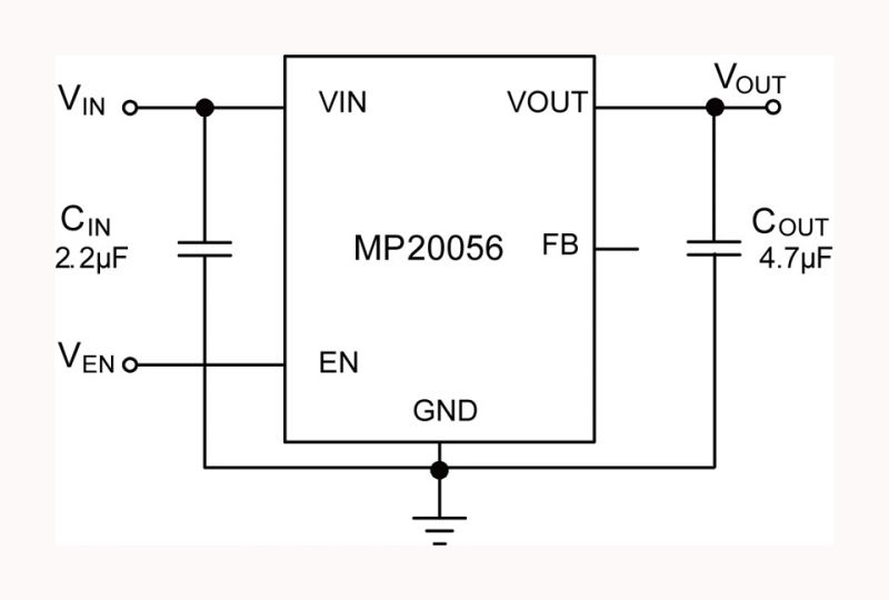 MP20056内置 PMOS,允许低至 150μA 的接地电流,使其适用于电池供电设备。其他保护功能包括低功耗关断保护、短路保护和过温保护。