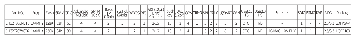 CH32F205/7系列是基于Cortex-M3内核设计的工业级互联型微控制器,此系列主频高达144MHz,独立了GPIO电压(与系统供电分离)。资源同比增加了随机数单元,4组运放比较器;提高串口UART数量到8组,电机定时器到4组。搭配时钟安全、电源管理、双组DMA、DAC、SDIO、CAN、FSMC等资源。提供USB2.0高速接口(480Mbps)并内置了PHY收发器,以太网MAC升级到千兆并集成了10M-PHY模块。